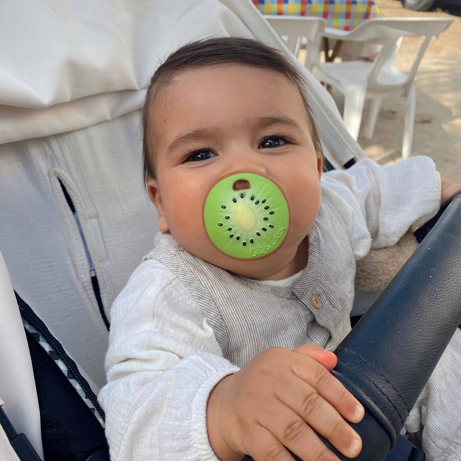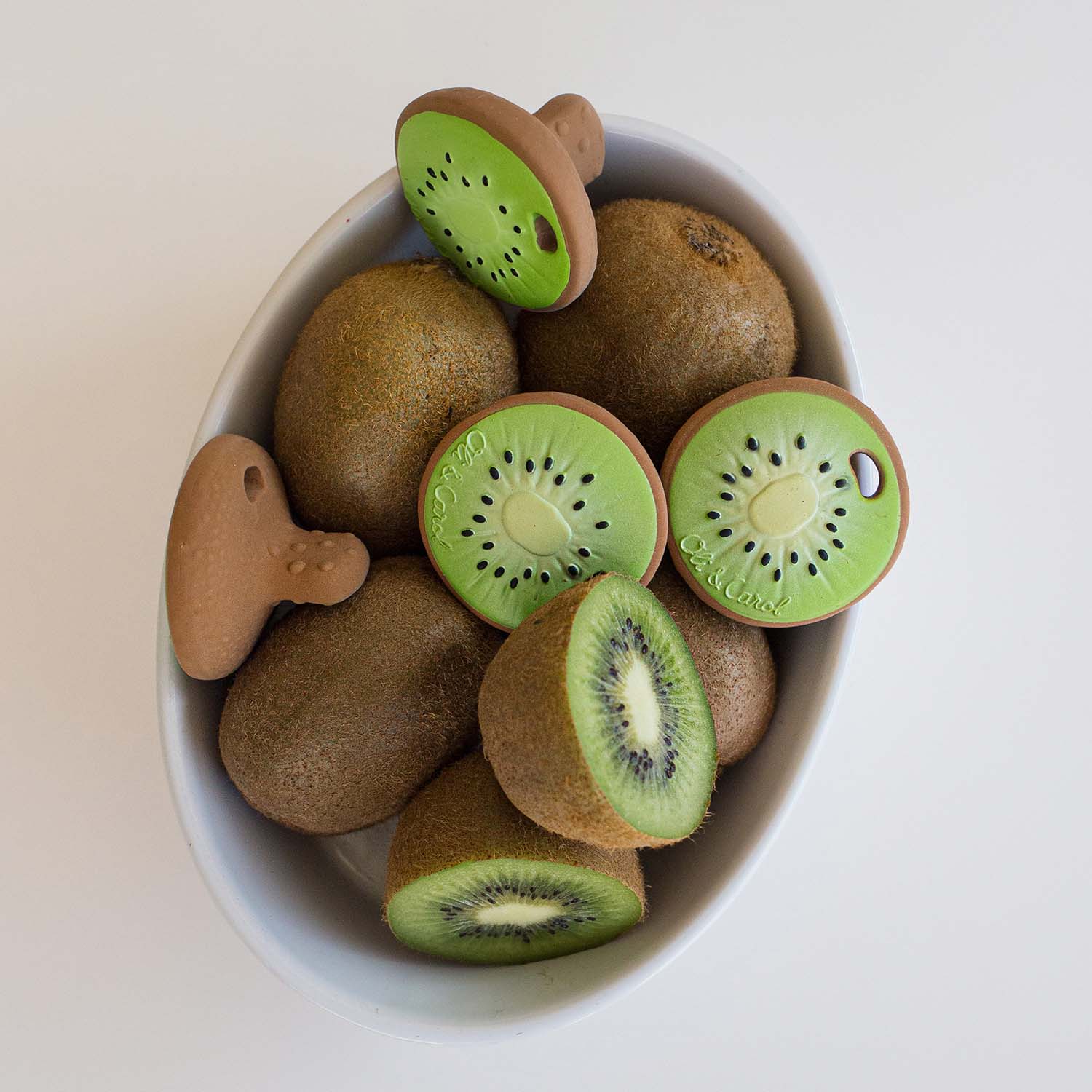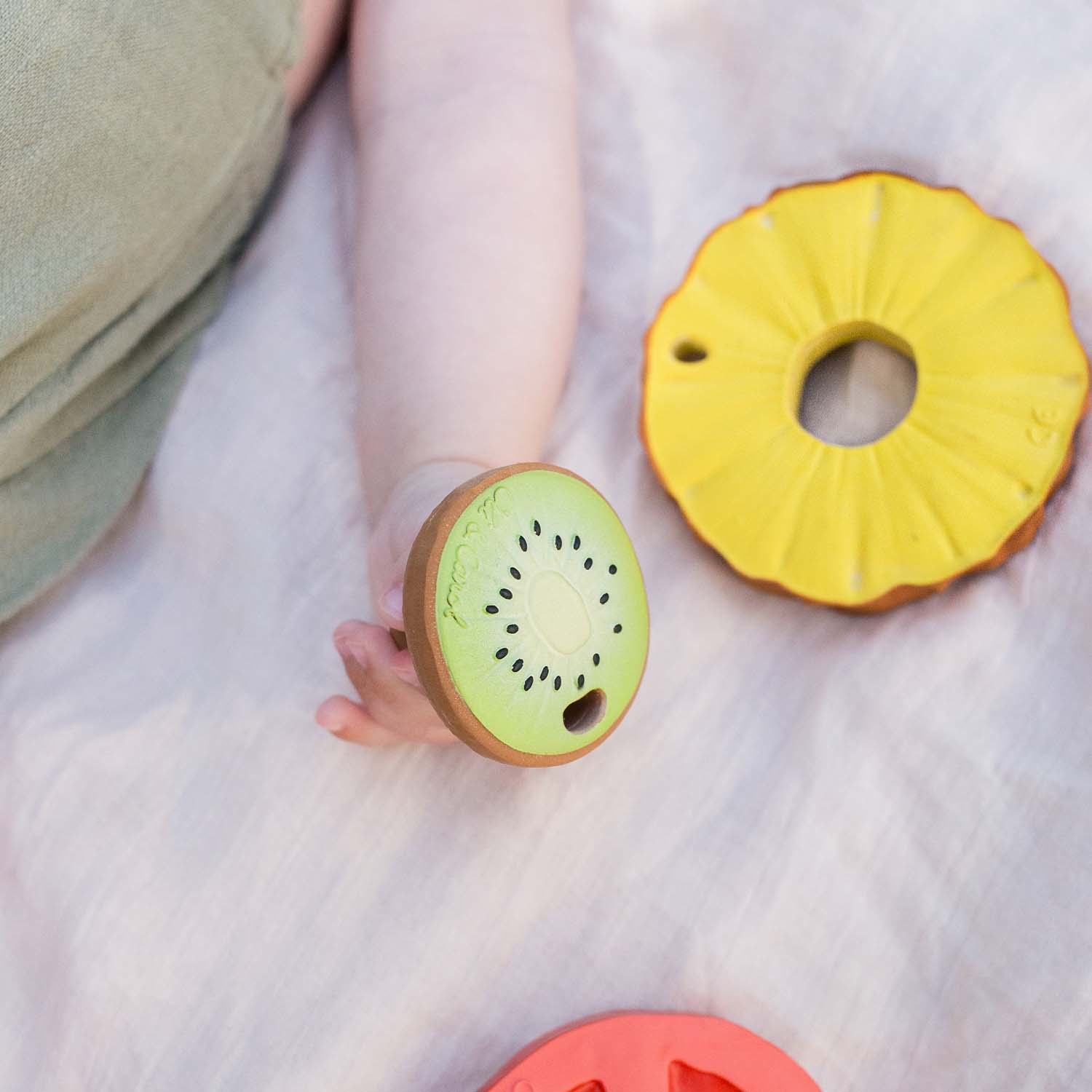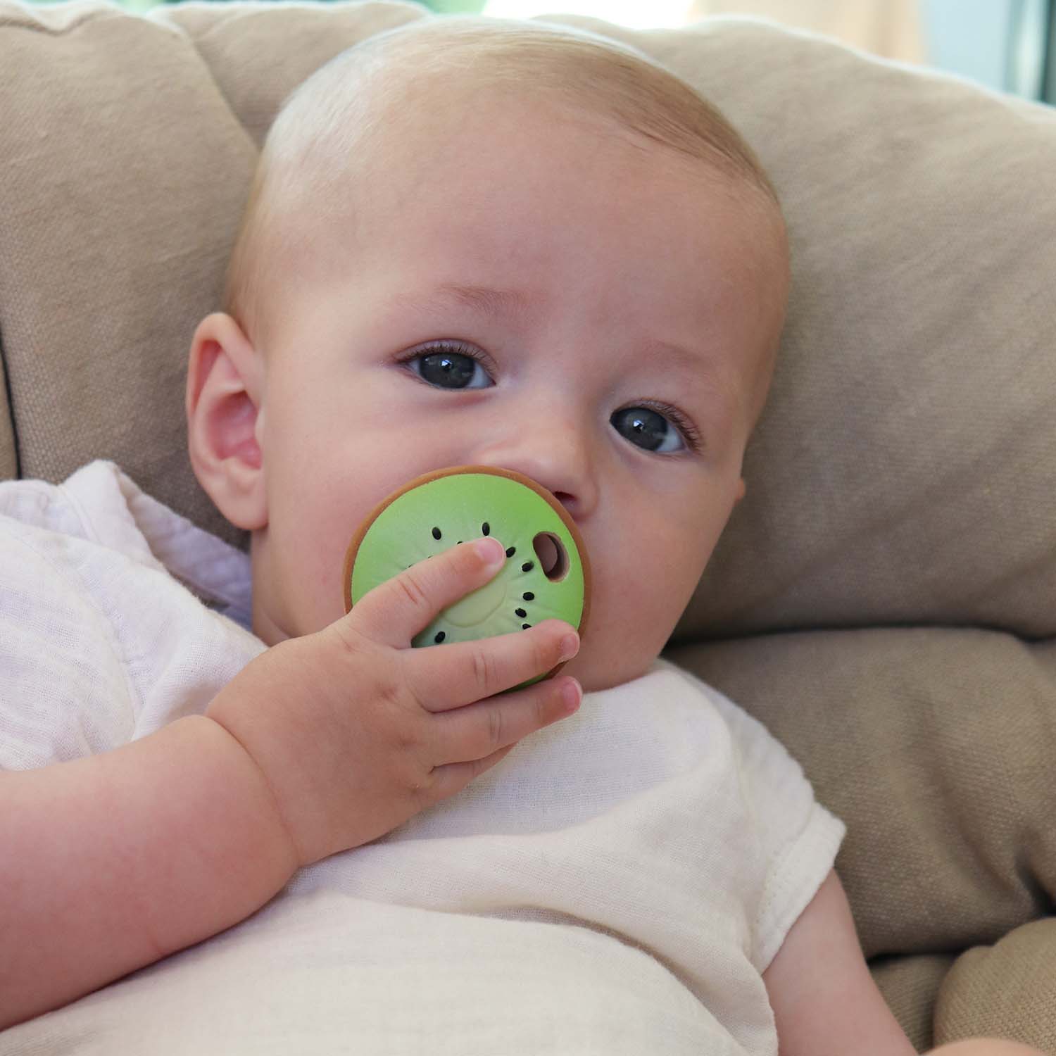José Antonio the Kiwi is a natural rubber mini teether for babies with an ergonomic design. Its raised spots and detailed textures make it very pleasing for little ones to soothe teething gums. Easy to hang from a strap and chew it on the go… take your chewy-to-go high & low!
