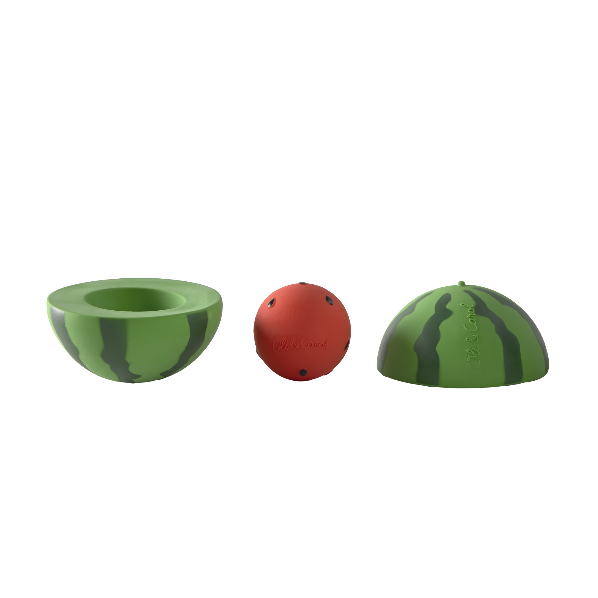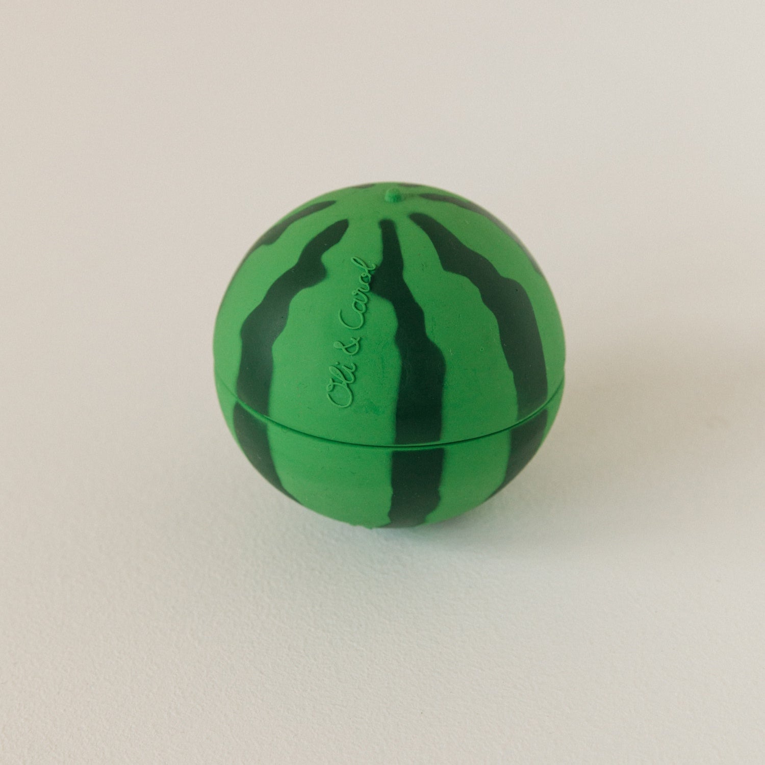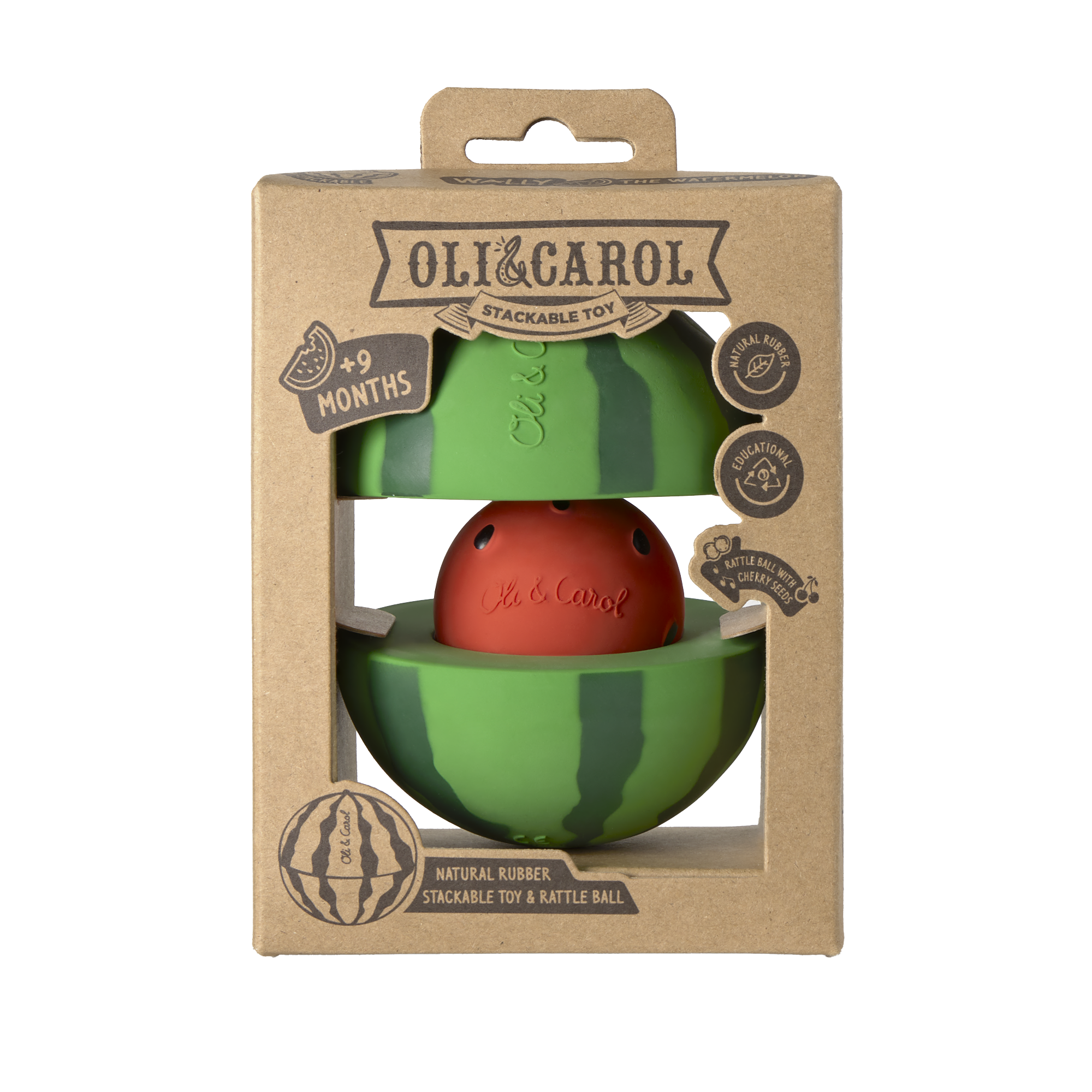 Stack & Bounce – Wally the Watermelon is a 3-in-1 toy: stacker, rattle & bouncing ball. Made from 100% natural rubber and filled with upcycled cherry seeds for a gentle sound.
