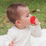 Spotty the Mushroom is a natural rubber mini teether for babies with an ergonomic design. Its raised spots and detailed textures make it very pleasing for little ones to soothe teething gums. Easy to hang from a strap and chew it on the go… take your chewy-to-go high & low!